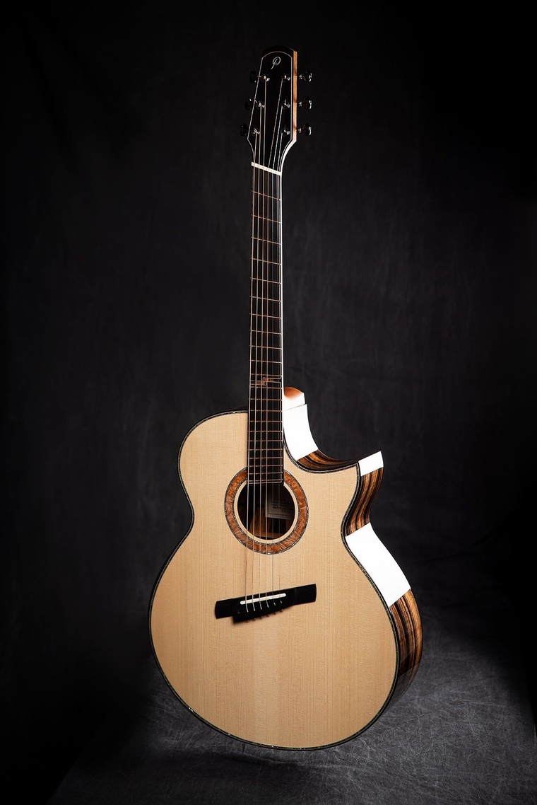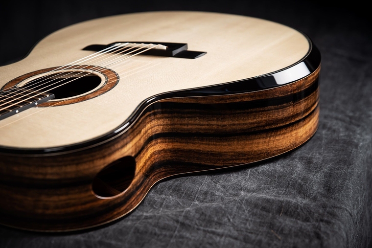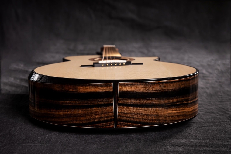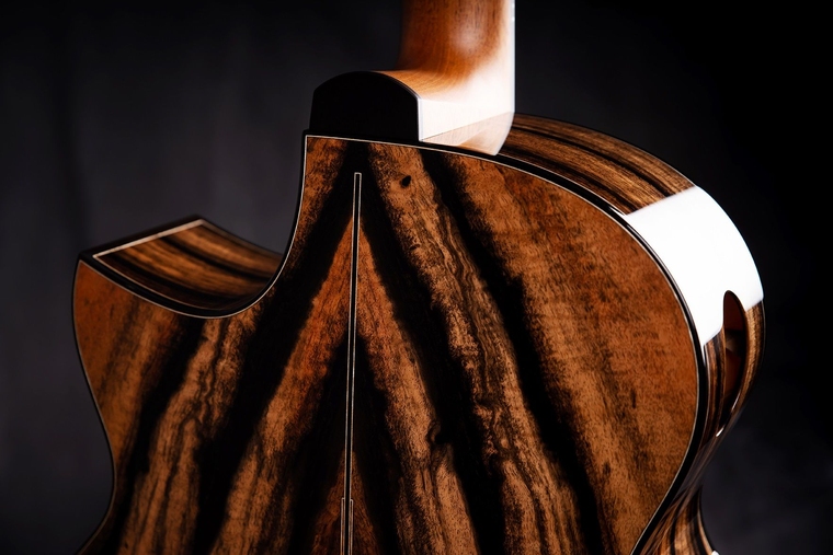 Back and sides (doubled): Figured Crelicam Ebony / Torrefied flamed Eucalyptus