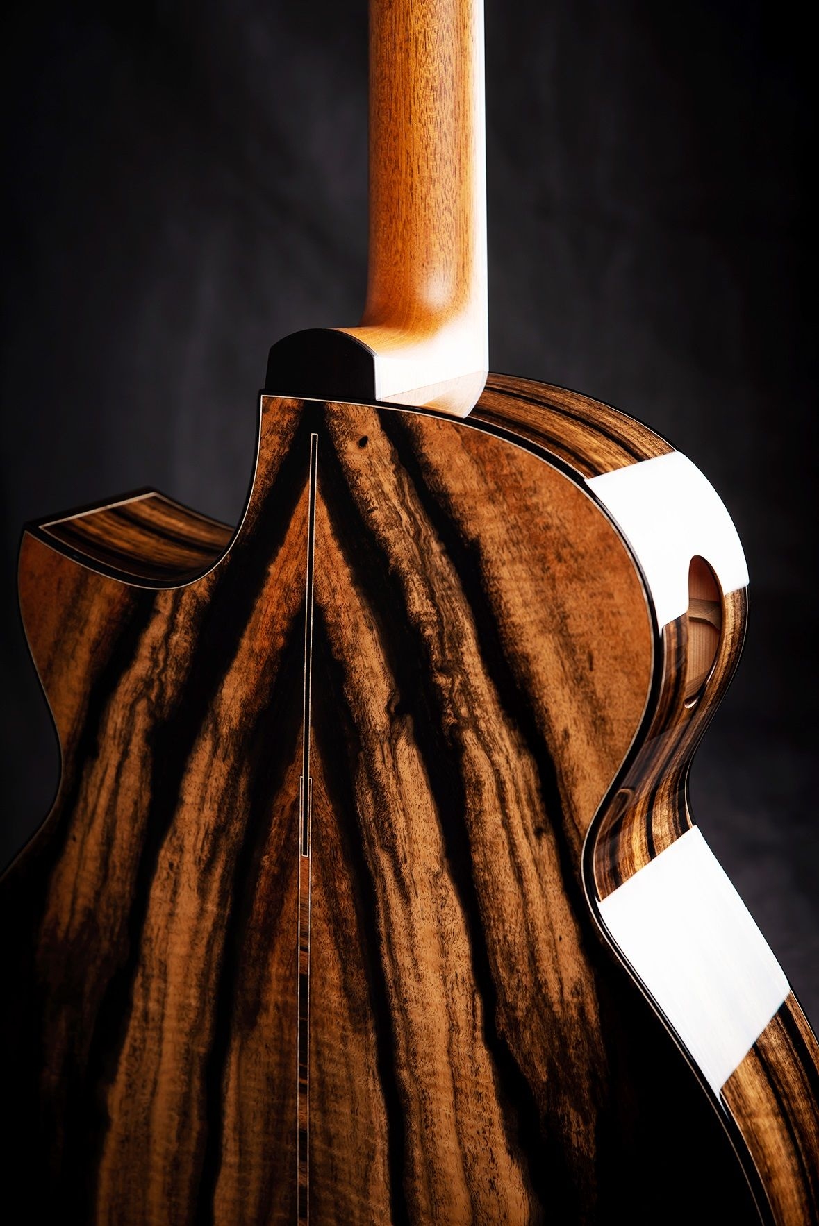 Back strip: Ebony (narrow strip) and Macassar Ebony (wide strip), with tiny maple purfling